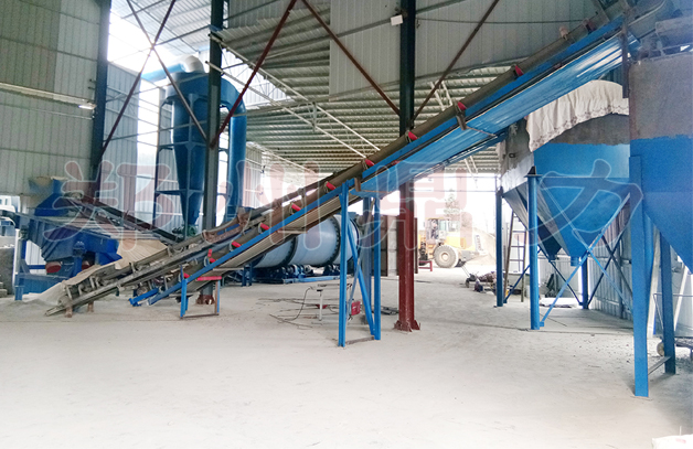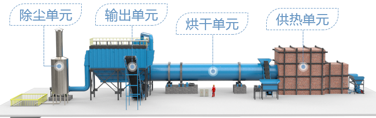 烘干系統主要由熱風爐、上料輸送機、滾筒烘干機、出料輸送機、引風機、旋風除塵器、袋式除塵器(或者濕式除塵器)和操作控制系統構成。設備采用順流干燥工藝,其工作原理如下:濕物料進入干燥滾筒后分以下幾個工作區:一是導料區,瓷泥瓷泥進入此區與高溫熱風接觸迅速蒸發水分, 物料在大導角的導料板抄動下,被導入下一個工作區;二是抄板區,瓷泥瓷泥在此區被抄板抄起形成料幕狀態,此時物料與熱風充分接觸,瓷泥瓷泥中的水分迅速蒸發剝離成為水蒸氣,水蒸氣隨即被引風機抽走,從而達到瓷泥瓷泥干燥的目的;瓷泥瓷泥在此區被干燥成水分小于5%(或者更低)以下的松散狀態,經過熱交換后物料達到所要求的水分狀態,進入最后的出料區;三是出料區,滾筒在此區不設抄板,物料在此區滾動滑行至排料口,完成整個烘干過程。